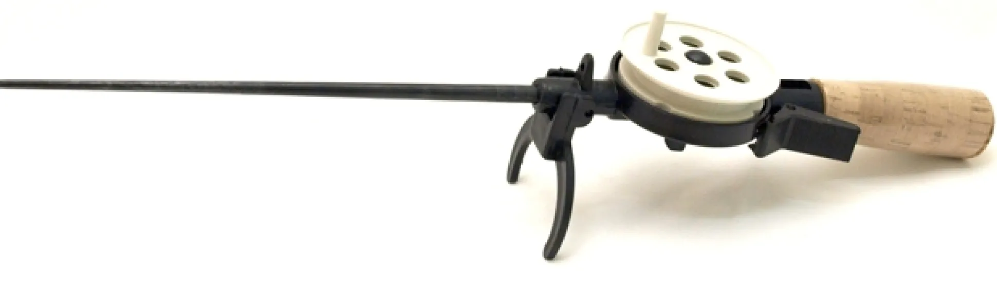 Pilkkivapa korkkikahvalla. Valkoisella kelalla. Sisään rakennetuilla pilkkijalaksilla