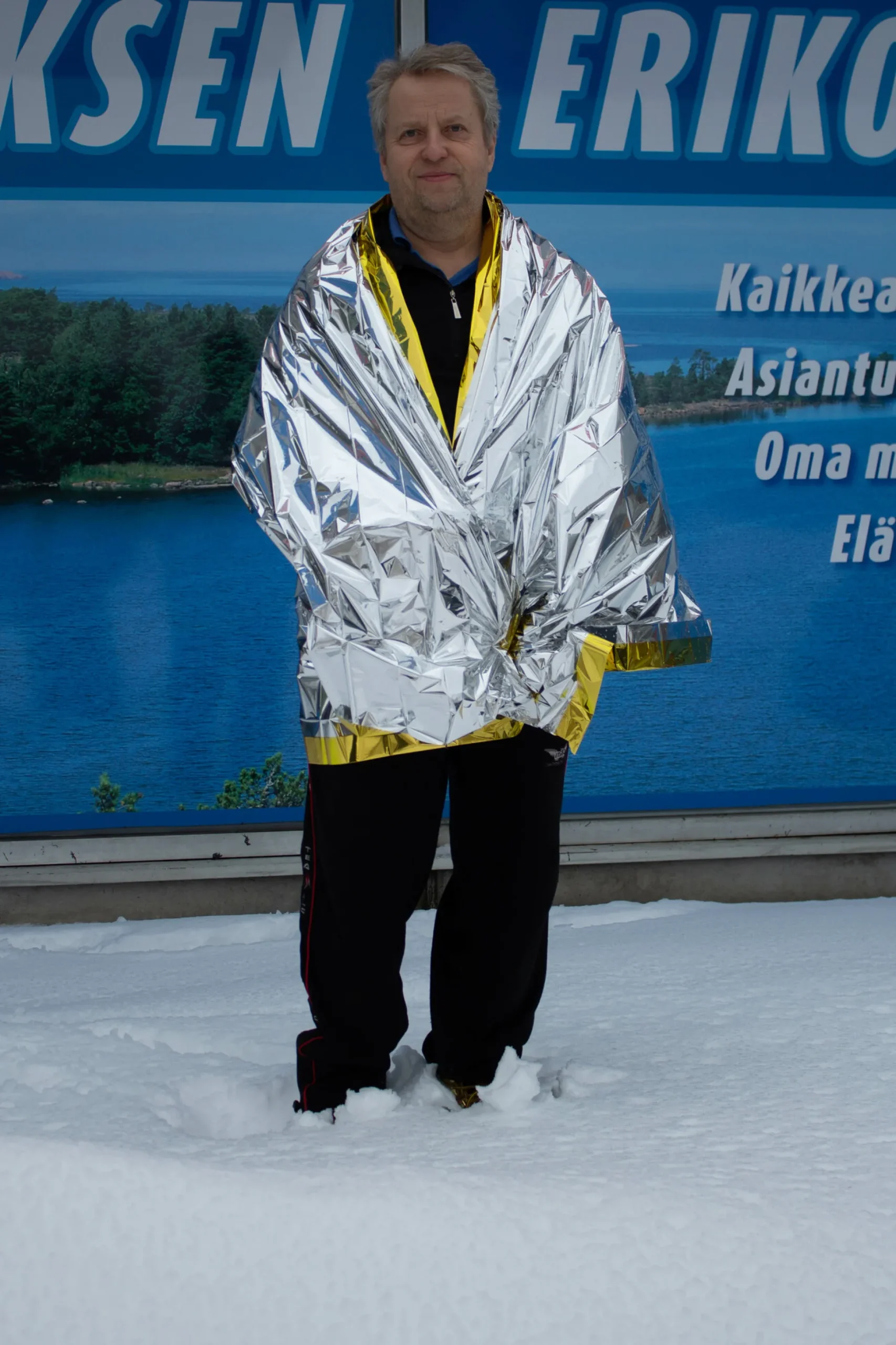 Mikäli putoat jäästä läpi niin peite kannattaa laittaa märän takin alle.