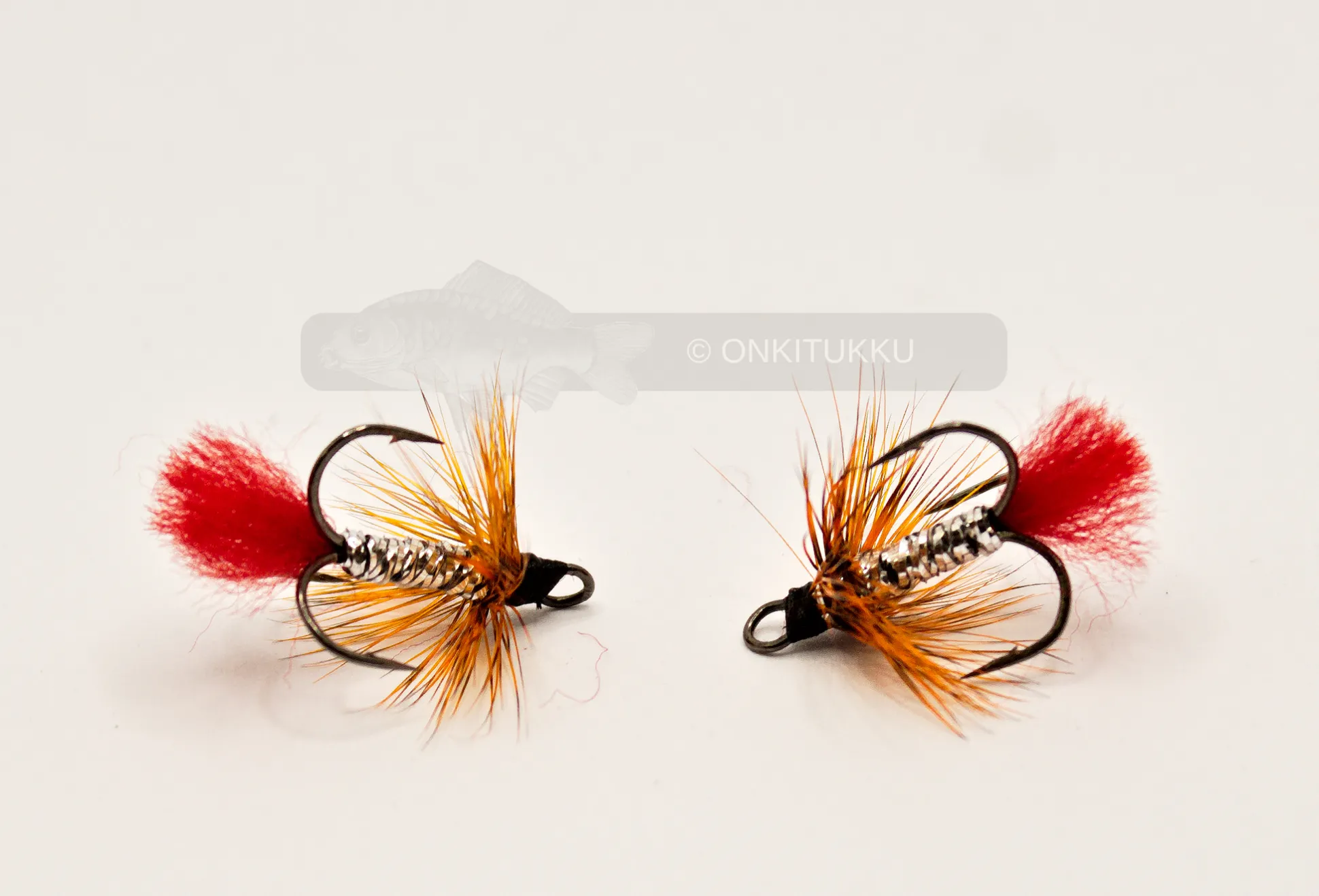 Pakkauksessa 5kpl perhoja. Sidonnassa käytetty Kujira:n kemiallisesti teroitettuja kolmihaarahiiliteräskoukkuja.