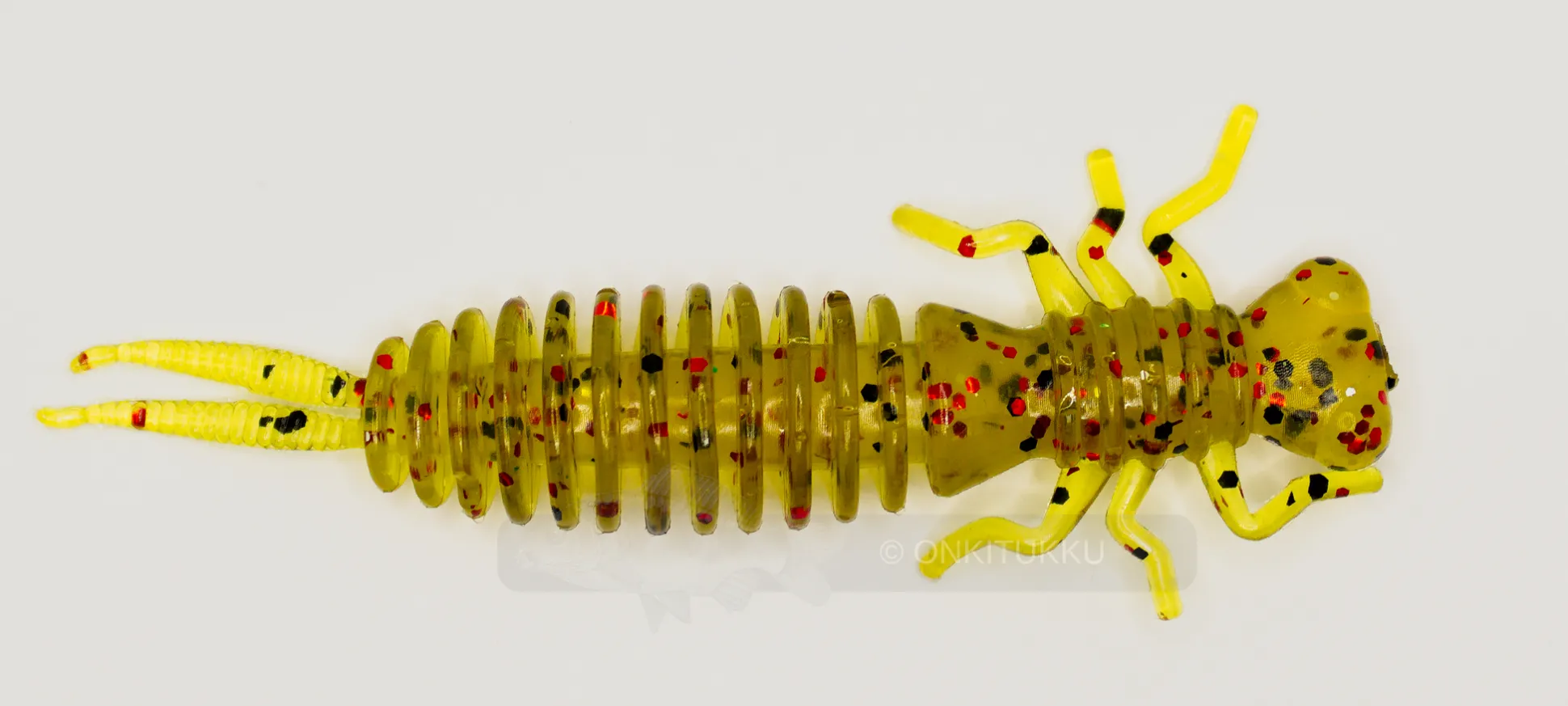Läpikuultava keltainen uritettu ötökkäjigi mustilla ja punaisilla hileillä.