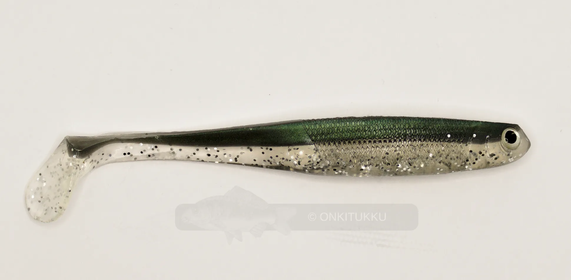 Kaksivärinen lapapyrstöinen kalajigi 3D-silmillä. Päältä harmaa, alapuolelta kirkas hopeahileillä. Venyvyys noin 40%. Erittäin hyväksi todettu malli kuhalle ja ahvenelle. Pussissa 3kpl