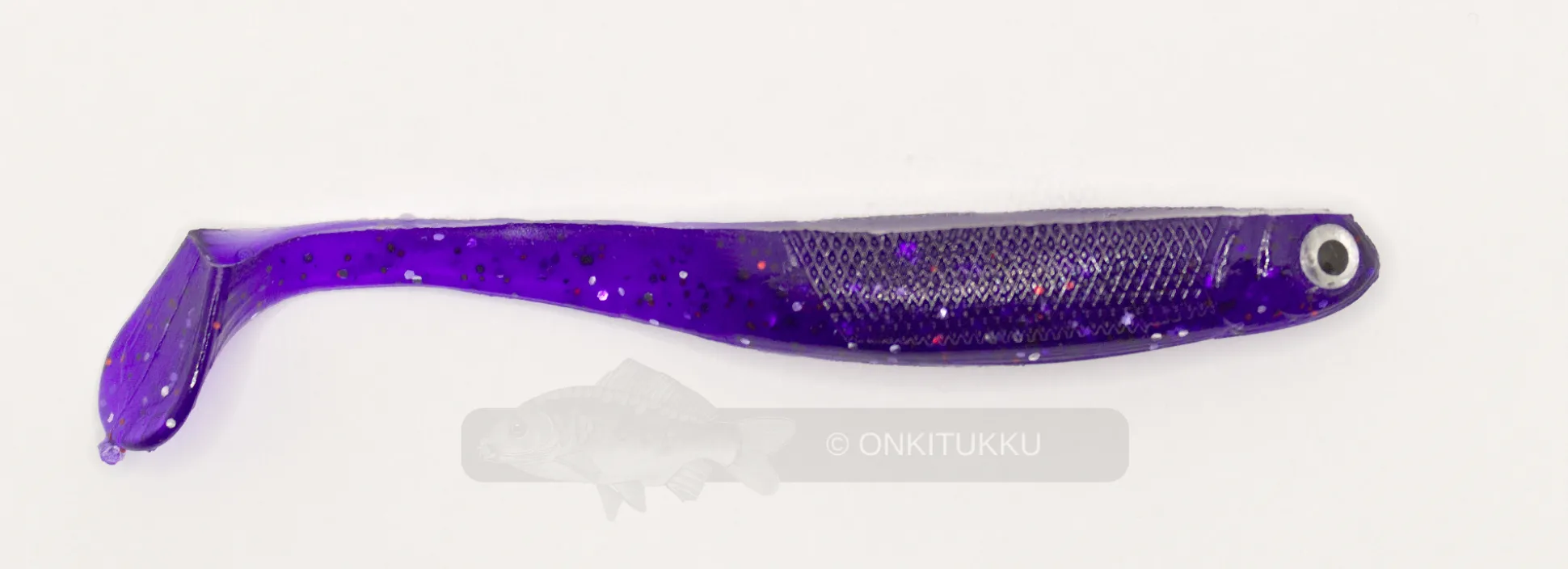 Lapapyrstöinen kalajigi 3D-silmillä. Venyvyys noin 40%. Erittäin hyväksi todettu malli kuhalle ja ahvenelle. Pussissa 4kpl