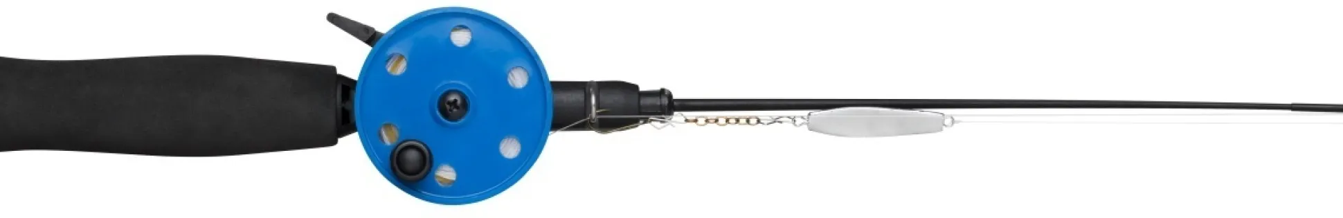 Käyttö valmis pilkkisetti. Pilkkivapa EVA foam kahvalla. Sininen kela, pyörivällä nupilla. Puolalla on 30 m Sufix Ice magic 0,25 mm. Setissä kirkas pilkki jonka päässä on ketjukoukku. Koukun koko 8