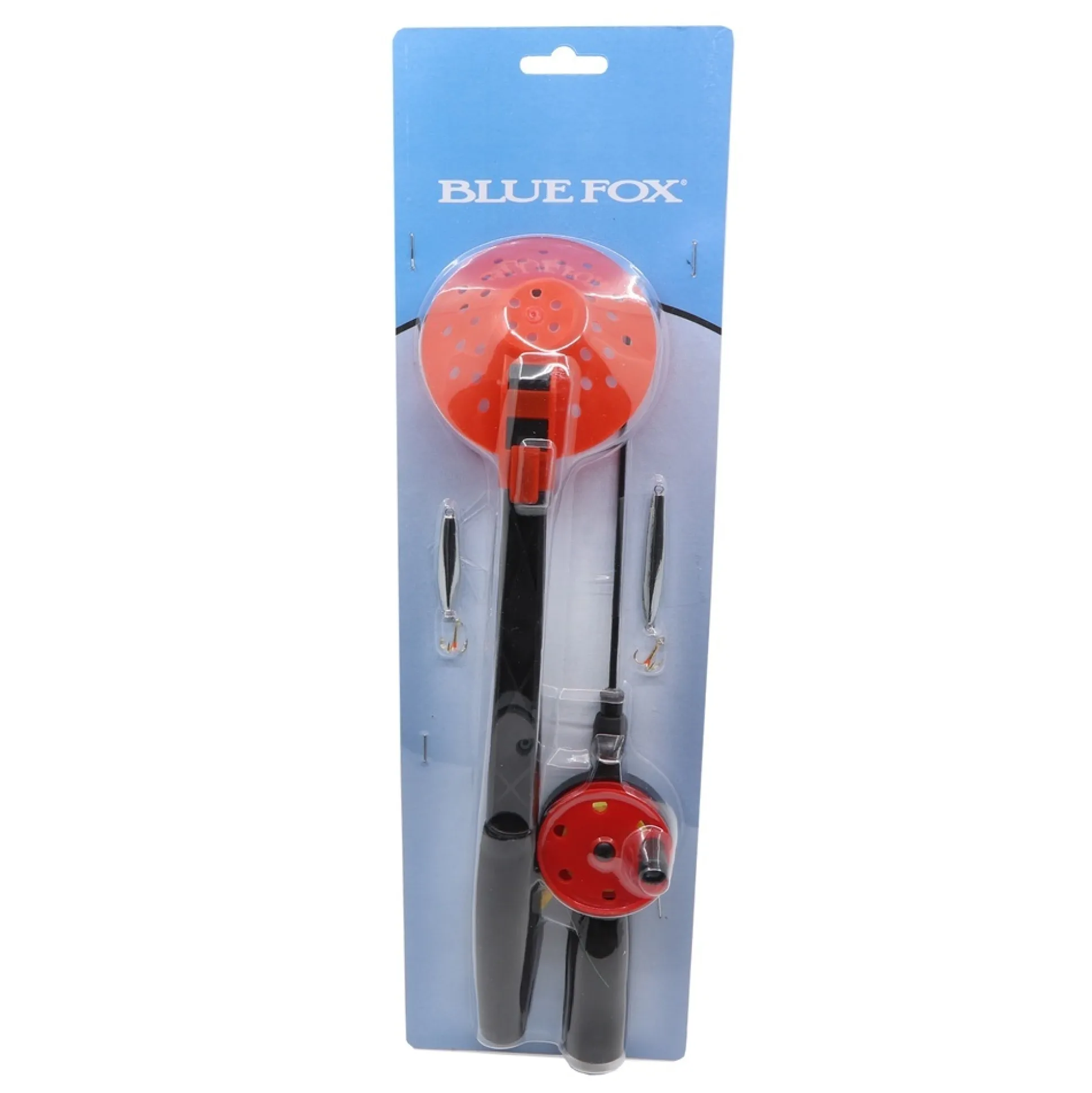 Valmis pilkkisetti. Pilkkivapa EVA foam kahvalla. Punainen kela, pyörivällä nupilla. Puolalla on keltaista siima. Setissä kaksi kirkasta kalastavaa pilkkiä kolmihaarakoukulla. Mukana tulee myös sohjokauha.