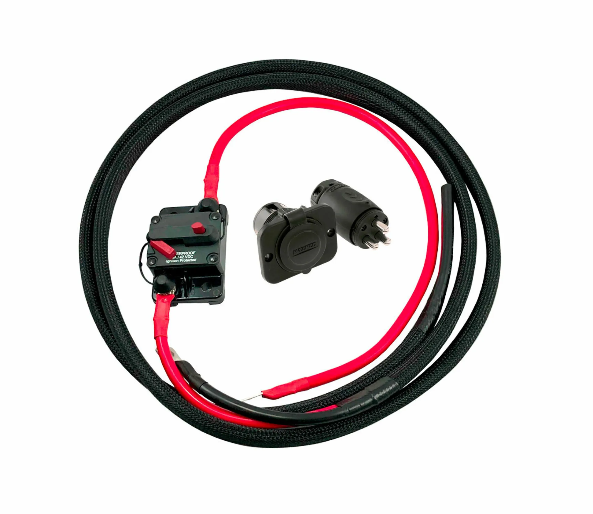 Valmis johtosarja esipuristetulla tinatulla kaapelilla asennuksen helpottamiseksi. Mukana vedenpitävä Marinco 70 A virtapistokesarja (vaatii asennuksen) ja 60 A automaattisulake.