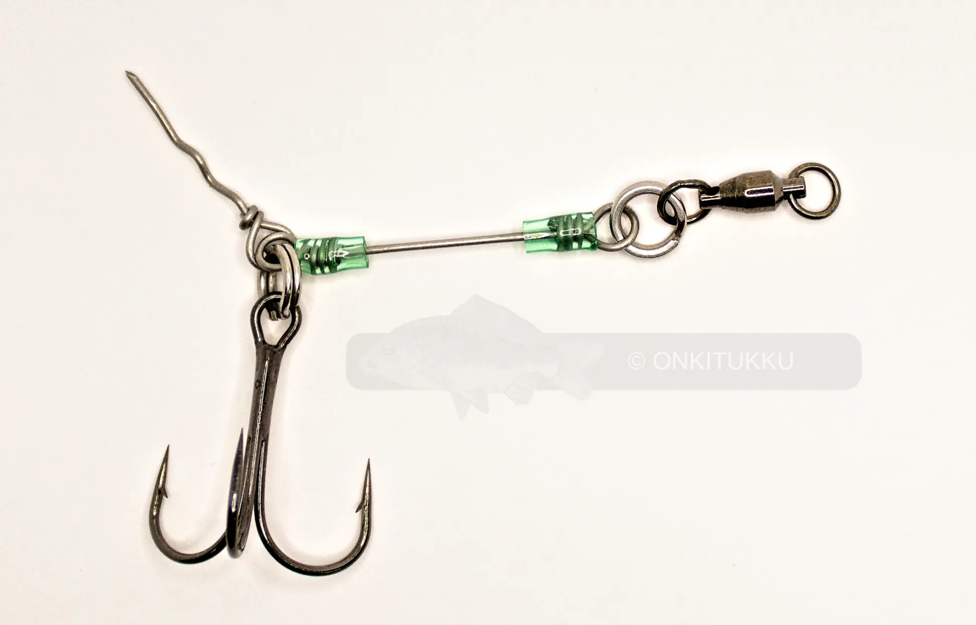Valmisrigi jigeihin ja shadeihin leikarilla ja kemiallisesti teroitetulla kolmihaarakoukulla jonka vieherenkaassa on kiinnityspiikki. Langanpituus on 4,5cm. Sopii hyvin noin 20cm shadeille.