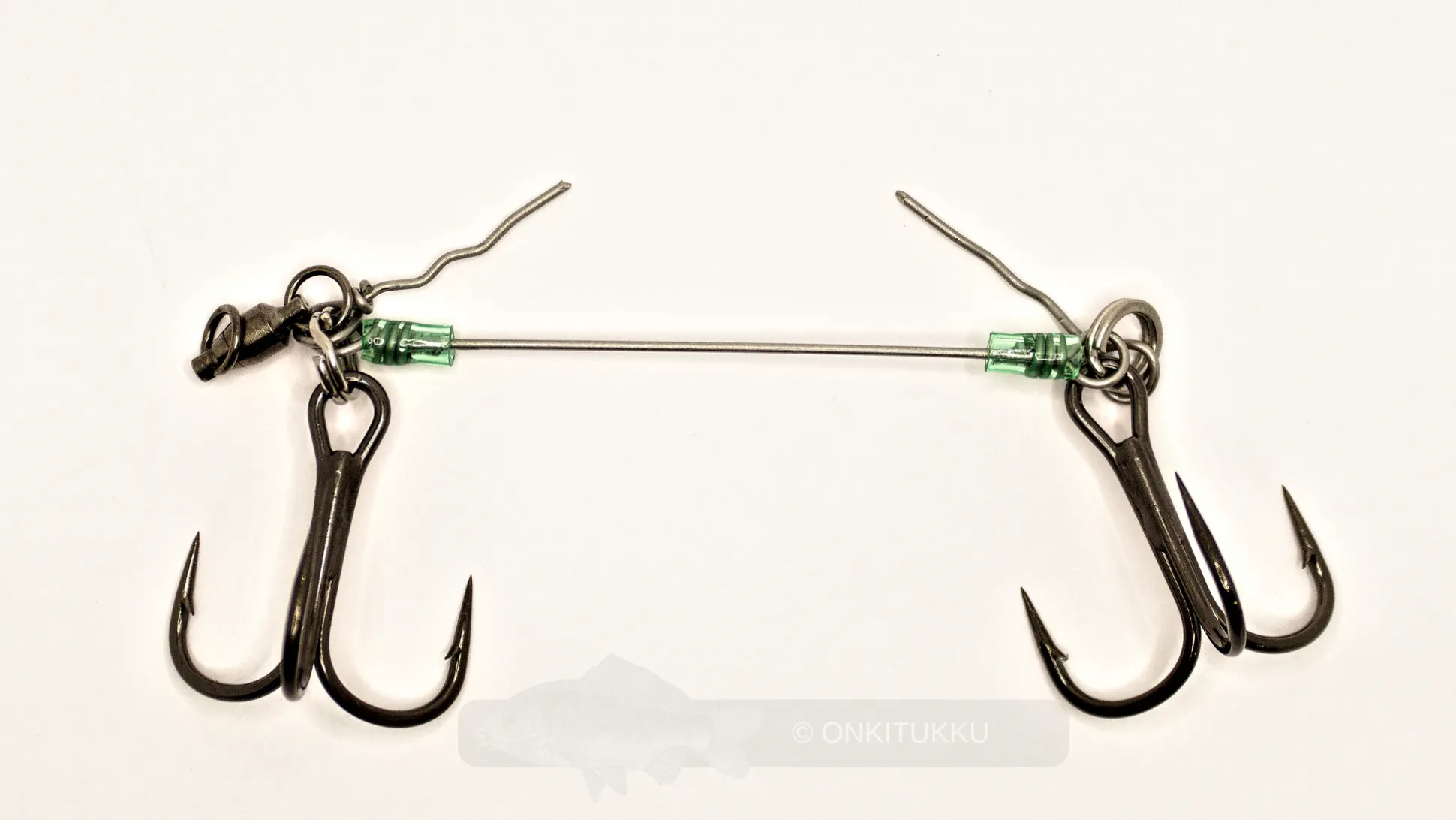 Valmisrigi jigeihin ja shadeihin leikarilla ja kahdella kemiallisesti teroitetulla kolmihaarakoukulla joiden vieherenkaissa on kiinnityspiikki. Langanpituus on 7,5cm. Sopii hyvin noin 22cm kumeille.