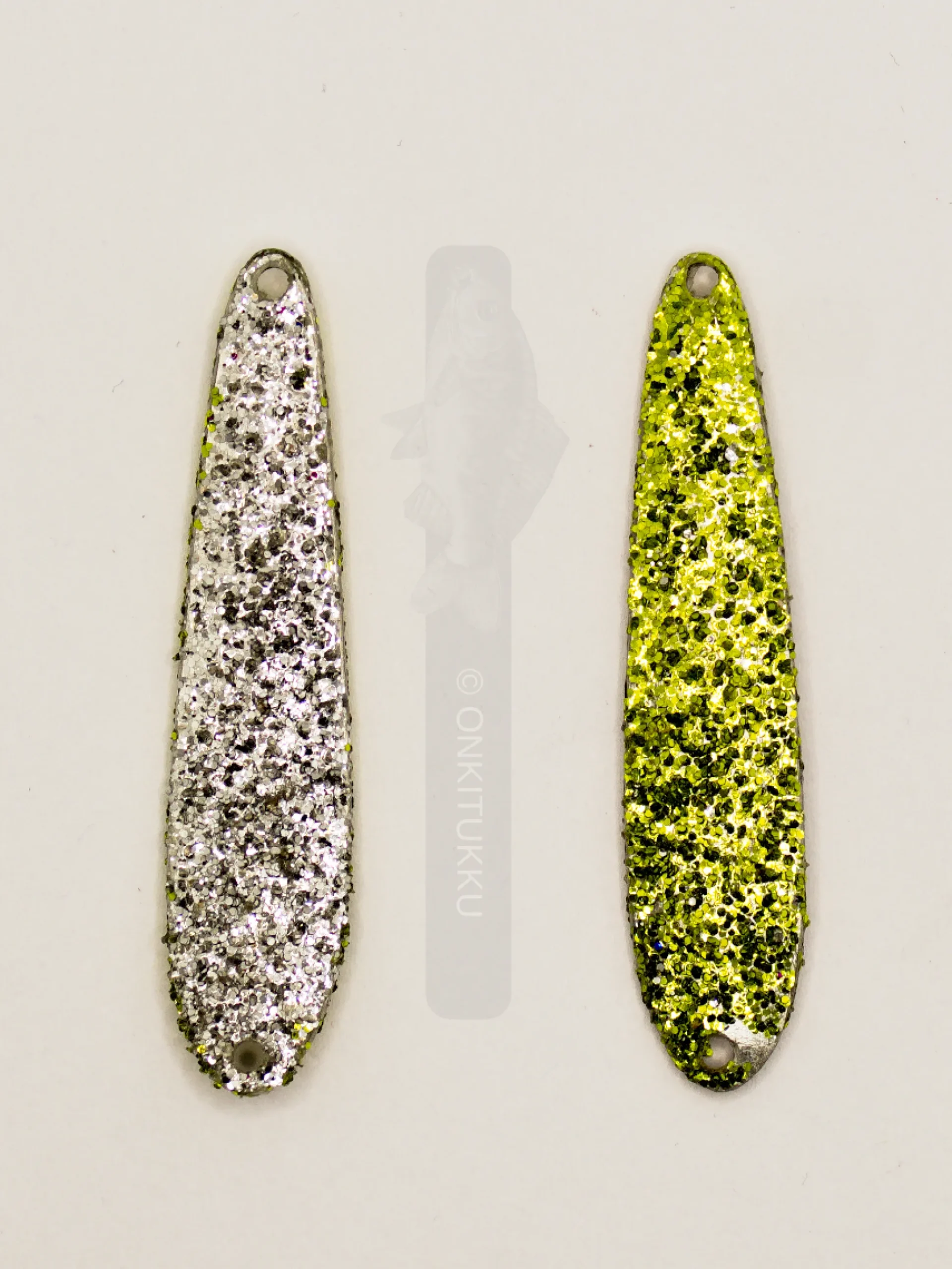 Hyvin kalastava alumiininen kuhapilkki, pilkkiä on hieman taivutettu paksummasta päästä. Pilkin molemmin puolin on hileitä.