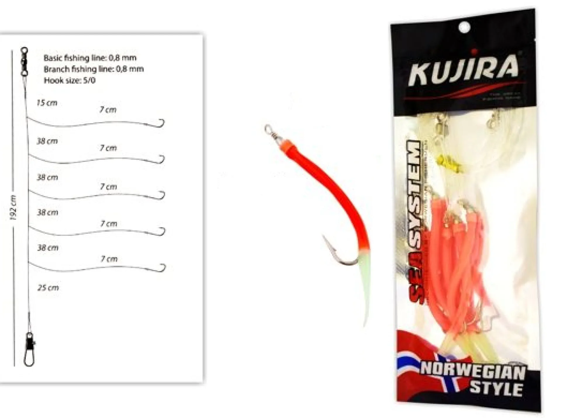 Kirkas siima paksuus 0,8mm. Koukkujen päällä pimeässä punainen kumi syötti jonka häntä on pimeässä hehkuva. Litkan pääsimassa on snaplukko ja tynnyrileikari. 5 kpl koukkuja.