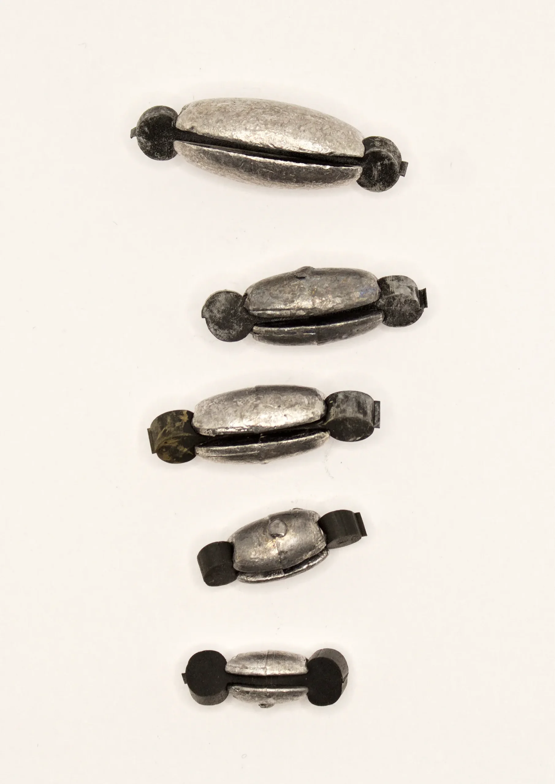 Oliivinmuotoisia painoja kumiholkilla valmistettu lyijystä. Pakkauksessa 25 kpl painoja