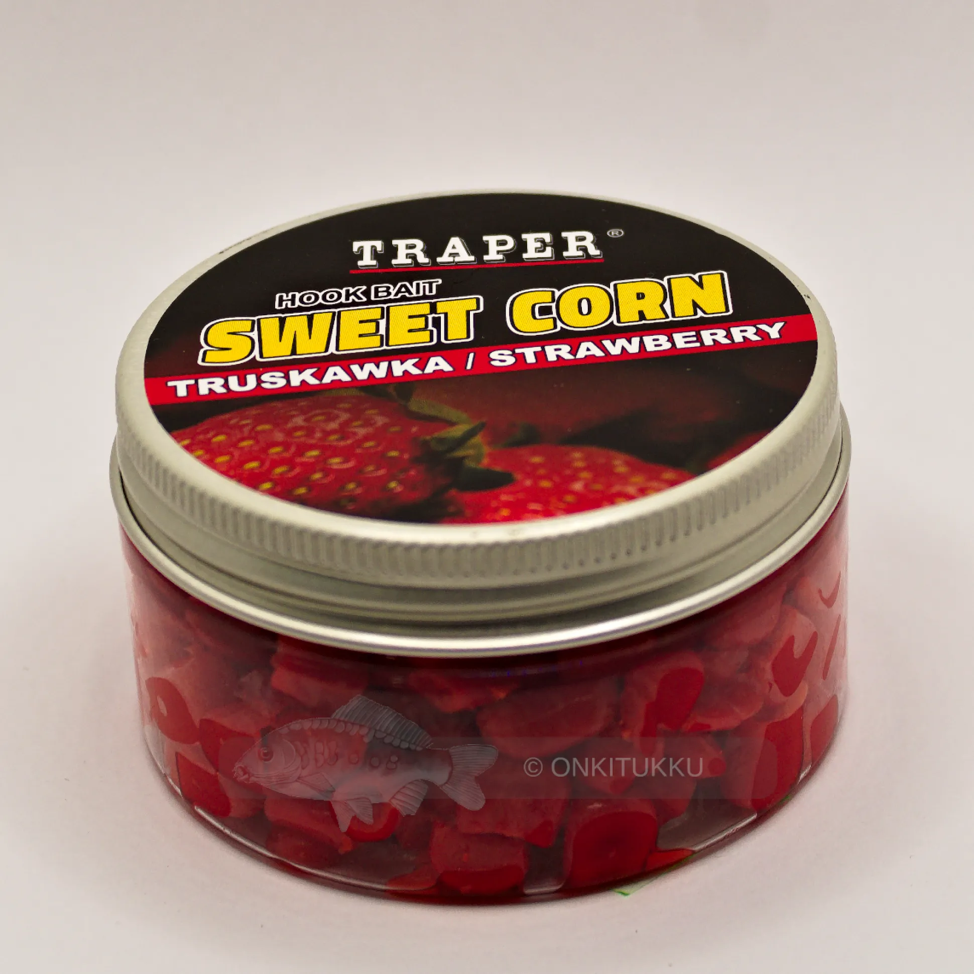 Värjätty maissinjyvä mansikan tuoksulla. Uudelleen suljettavassa purkissa on 70g