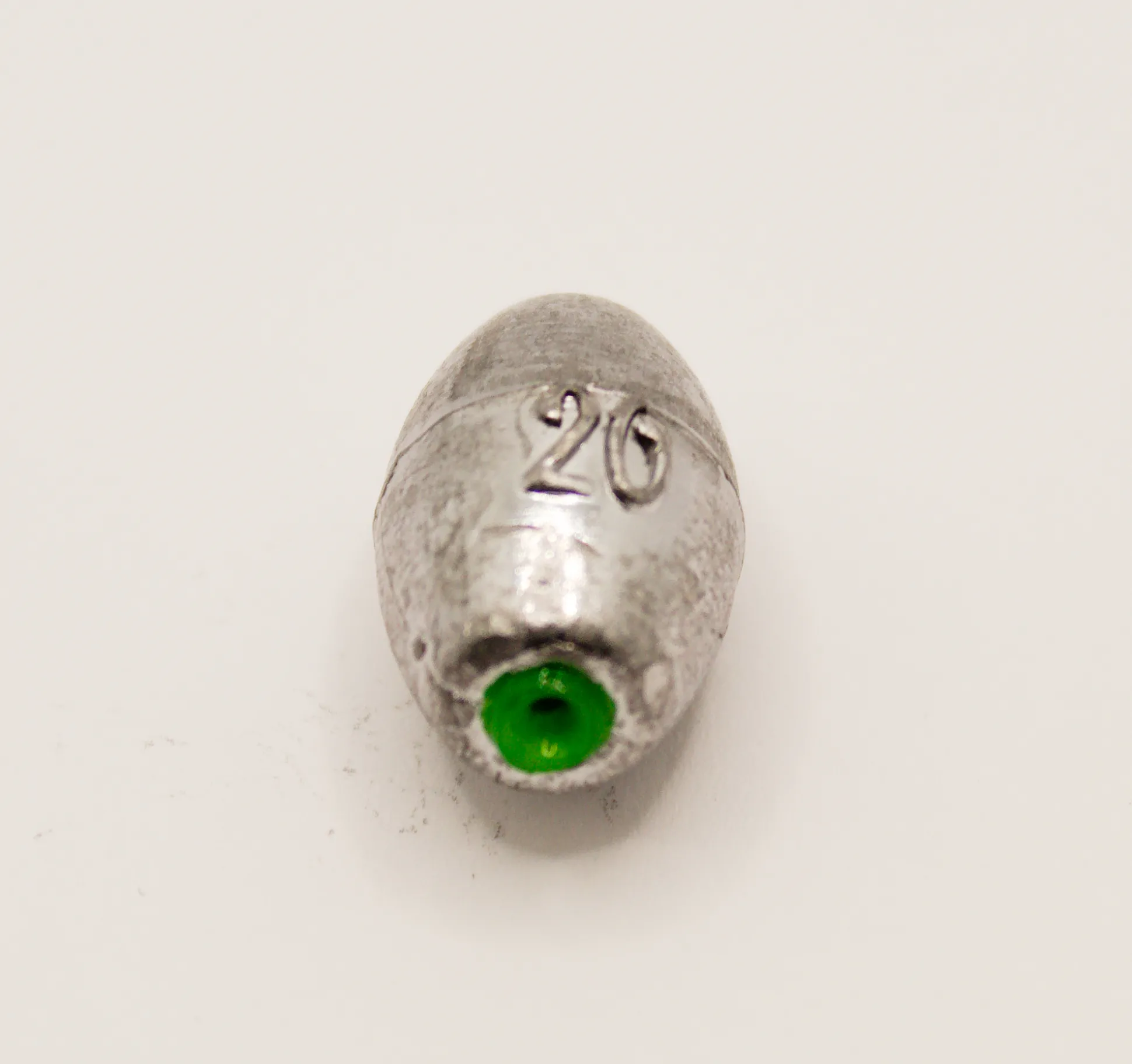 Oliivinmuotoinen liukupaino valmistettu lyijystä. Sisällä muovinen putki estämässä siiman kulumista. Painoon painettu paino 40g todellinen paino 38g