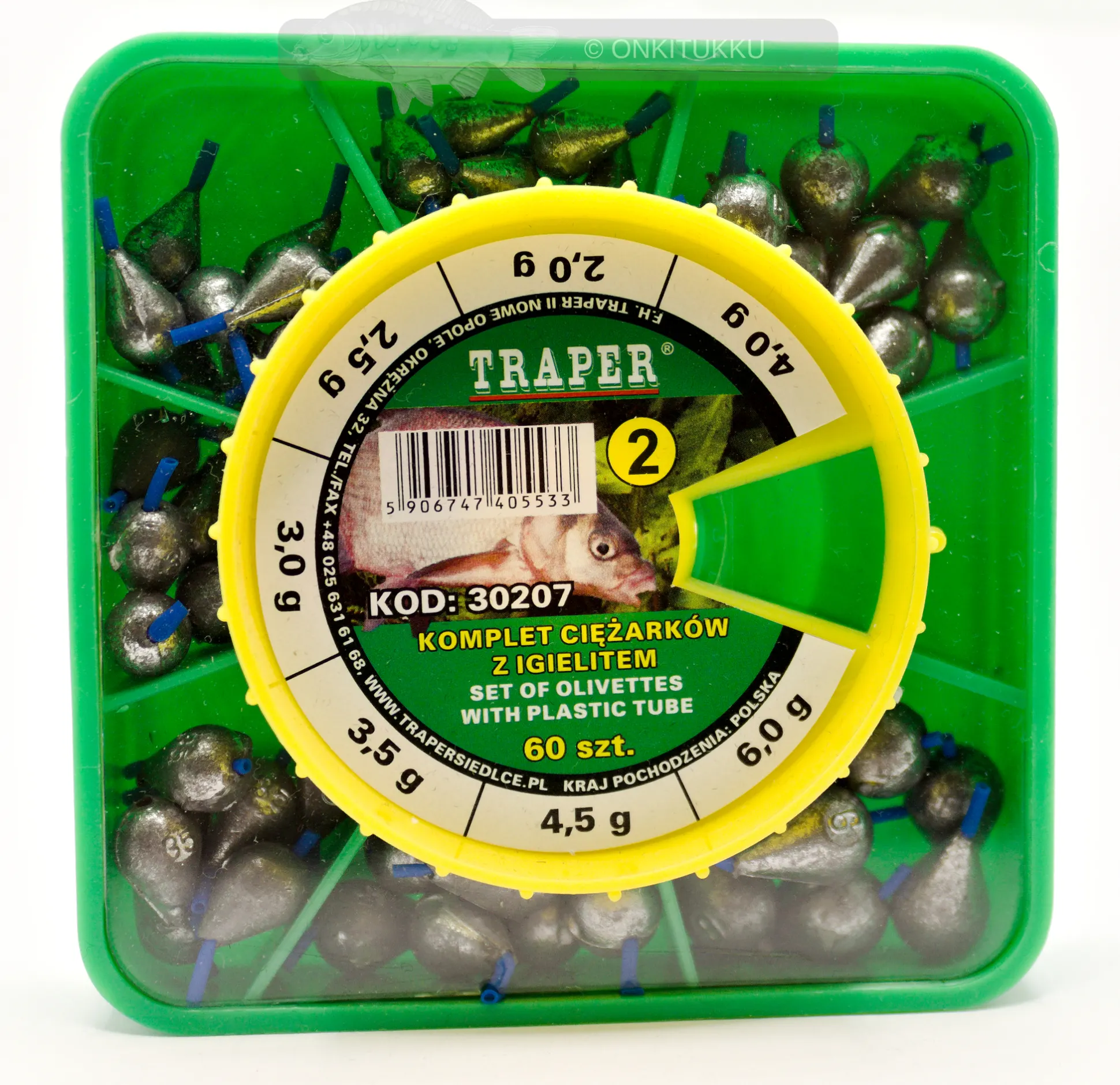 Olivettipaino jolla on hydrodynaaminen muotoilu. Hydrodynaamisuus estää olivettipainoa hyökkäämästä kun tiputtaa onkilaitetta veteen. Ei sotkeudu siimaan helposti. Olivettipainossa on sisäinen silikoniletku, joka suojaa siimaa kulumiselta. Rasiassa on yhteensä painoja 60kpl. Tämä on se lyhyempi ja pulskempi malli. Rasiassa on seuraavat koot: 2,0g – 2,5g – 3,0g – 3,5g – 4,0g – 4,5g – 6,0g