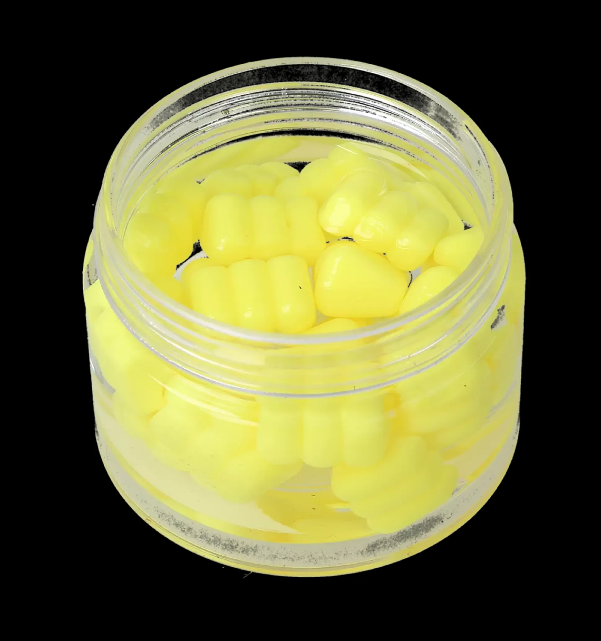 Kelluva pop-up boilie dipissä. Dipin tuoksu mansikka. Kelluva pop-up boilie on hyvä ratkaisu kun pohja on pehmeä tai peittyy kasvillisuudesta. Voidaan käyttä hair-rigissä yksinään tai yhdistettynä tavalliseen boilieen, jolloin saadan ns. snowman. Keinotekoinen maissinjyvä.