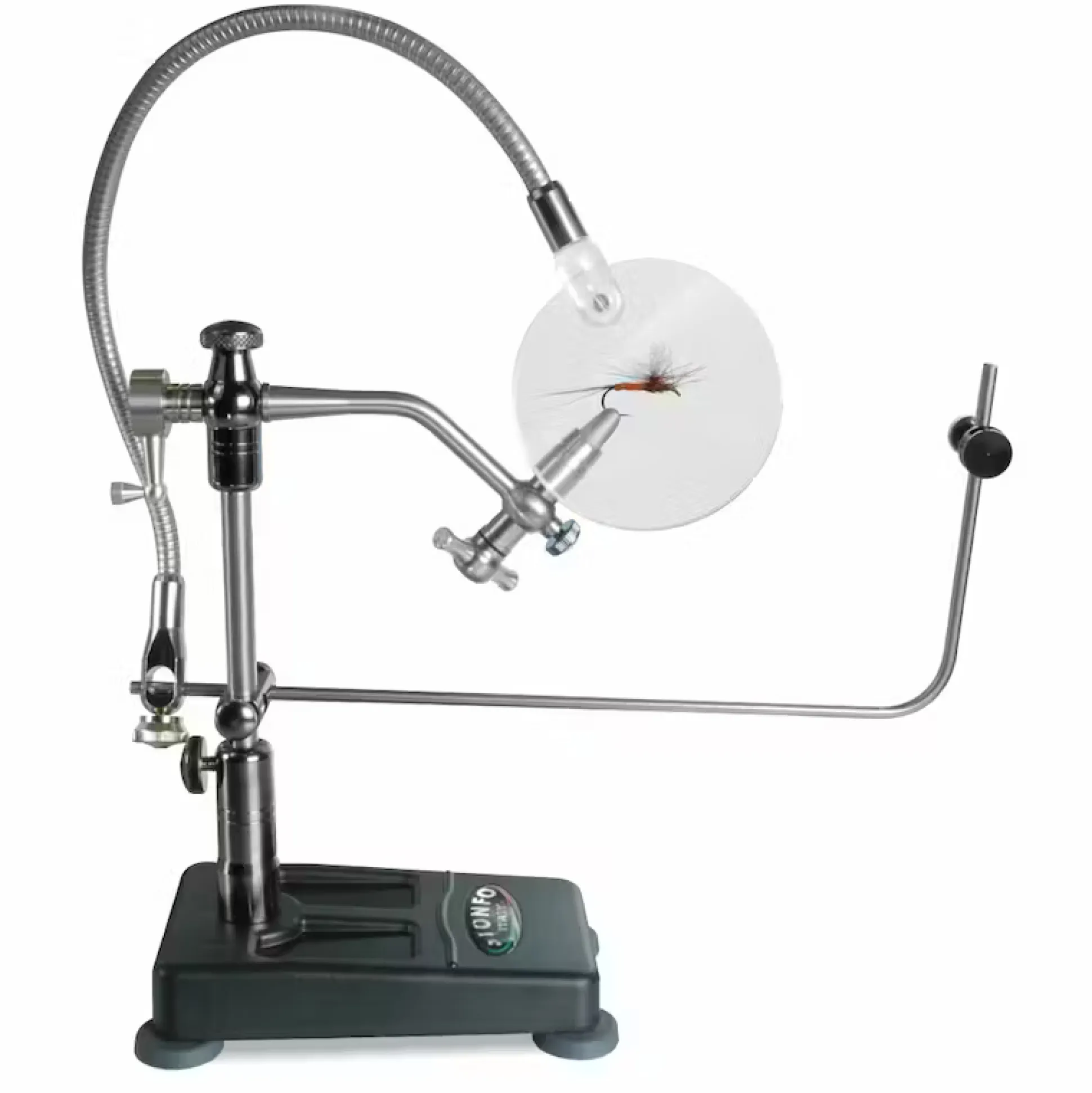 Stonfo Magnifying glass suurennuslasin avulla näet helposti perhojen pienetkin yksityiskohdat tarkasti. Suurennus lasissa on 2x suurennus ja taipuisa varsi jota voi säätää sopivaan asentoon. Suurennus lasin voi kiinnittää sidontapenkkeihin joissa on 8-10 mm jalka tai työkaluvarsiin joiden halkaisija on 5 mm.
